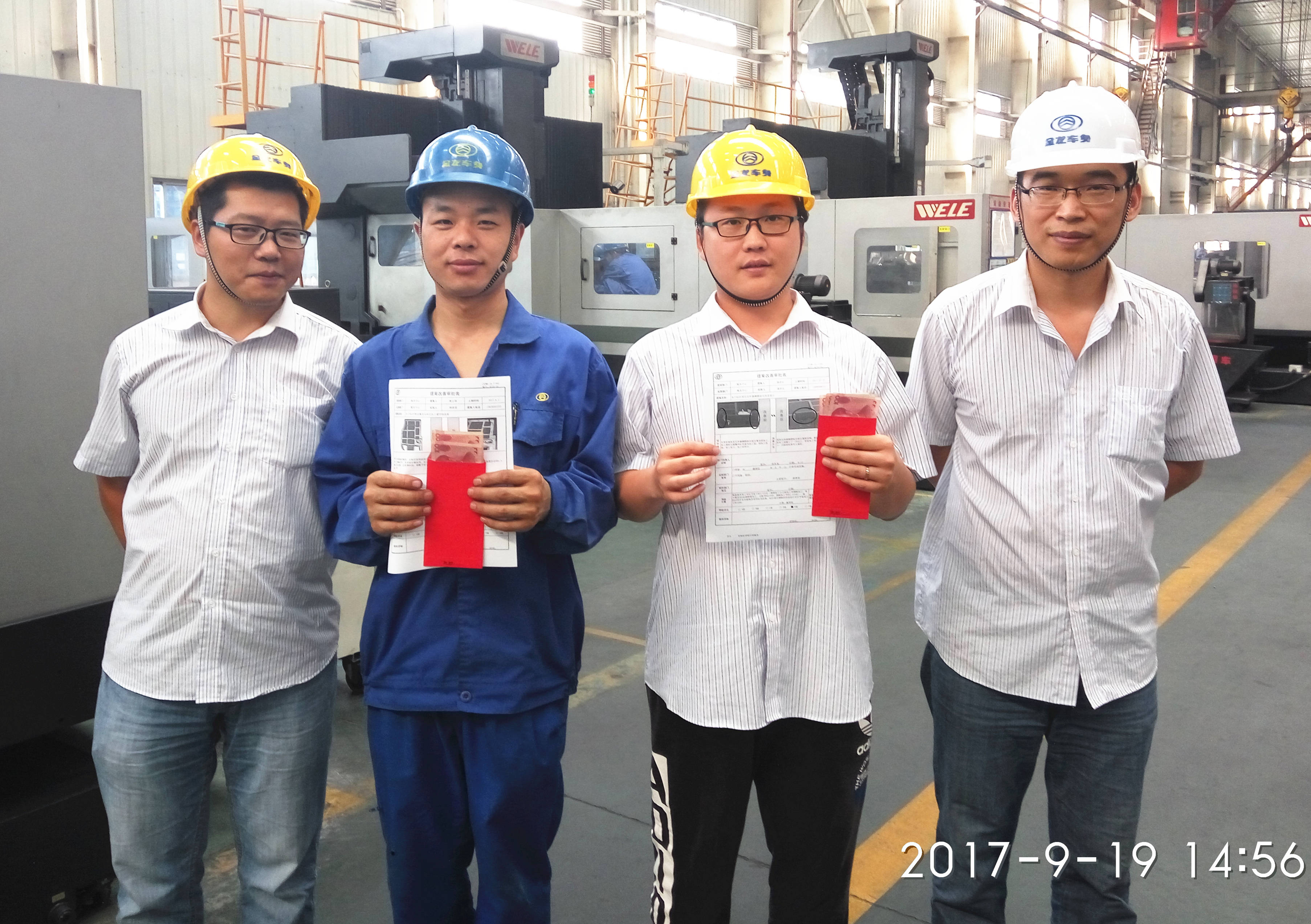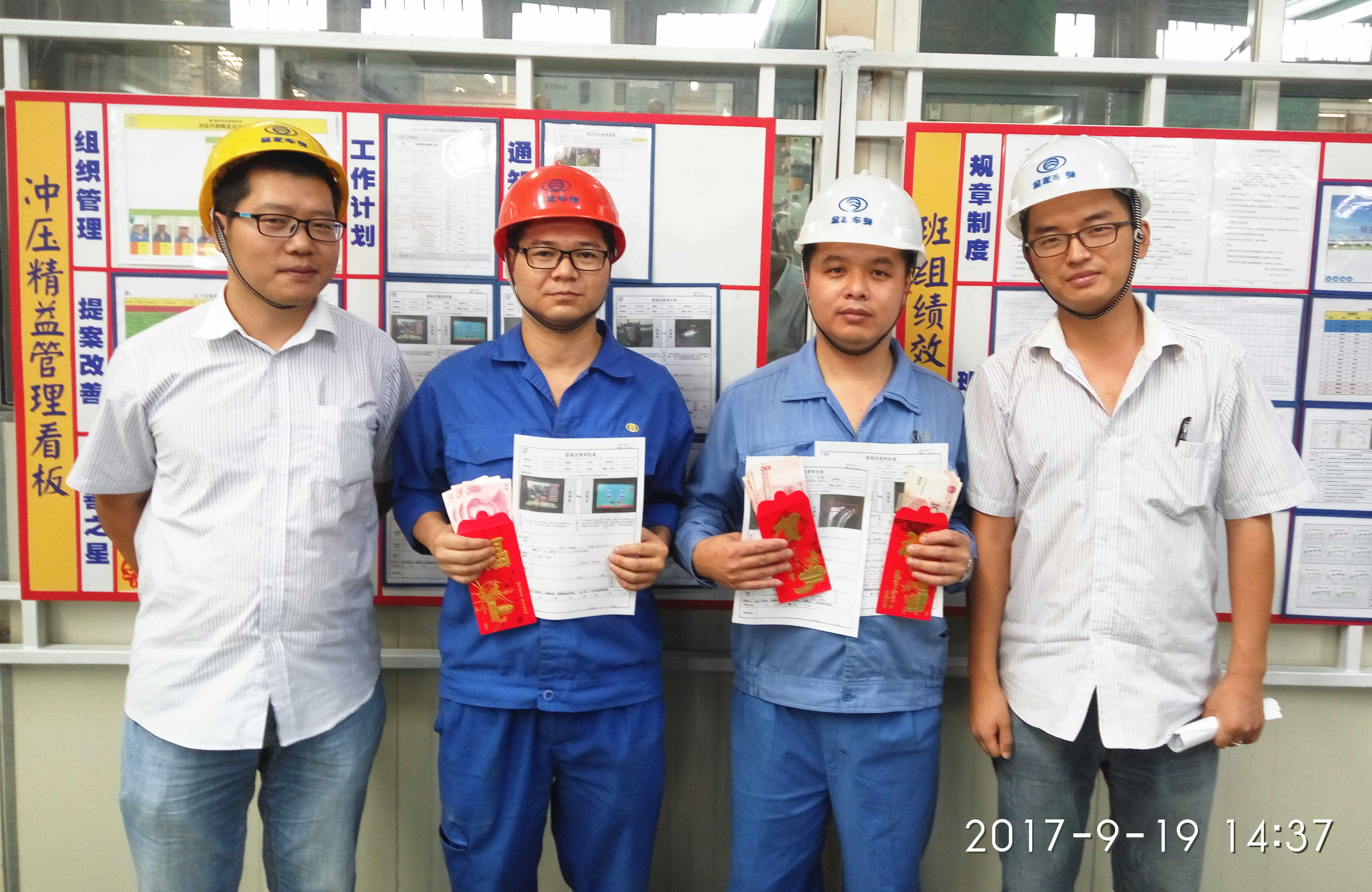 为鼓励全员参与提案活动,8月份精益推委会决议每月对E级以上提案现场发放奖金并宣传,9月份精益生产部经理张润朋代表公司精益推委会向几位优秀提案人(许亚棋、余森兵、叶国兴、王毅辉、潘泽伦、樊正锋)颁发提案奖励,并殷切勉励各位员工继续努力,发扬工匠精神,多做改善,不断创新。